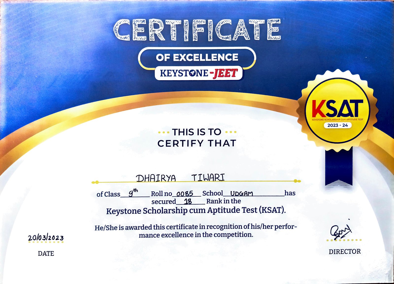 Certificate of excellence, Keystone Scholarship Cum Aptitude Test (KSAT)